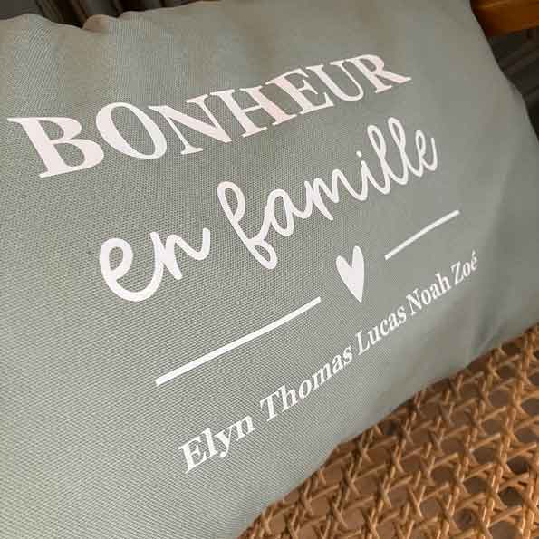 ✨ Coussin Bonheur en famille- Le cadeau original à 100% ✨Découvrez notre magnifique Coussin Bonheur en famille, conçu spécialement pour ajouter une touche unique et originale à la votre intérieur ! 🌟Avec son design doux et élégant, ce coussin deviendra un élément incontournable de votre déco.Caractéristiques: