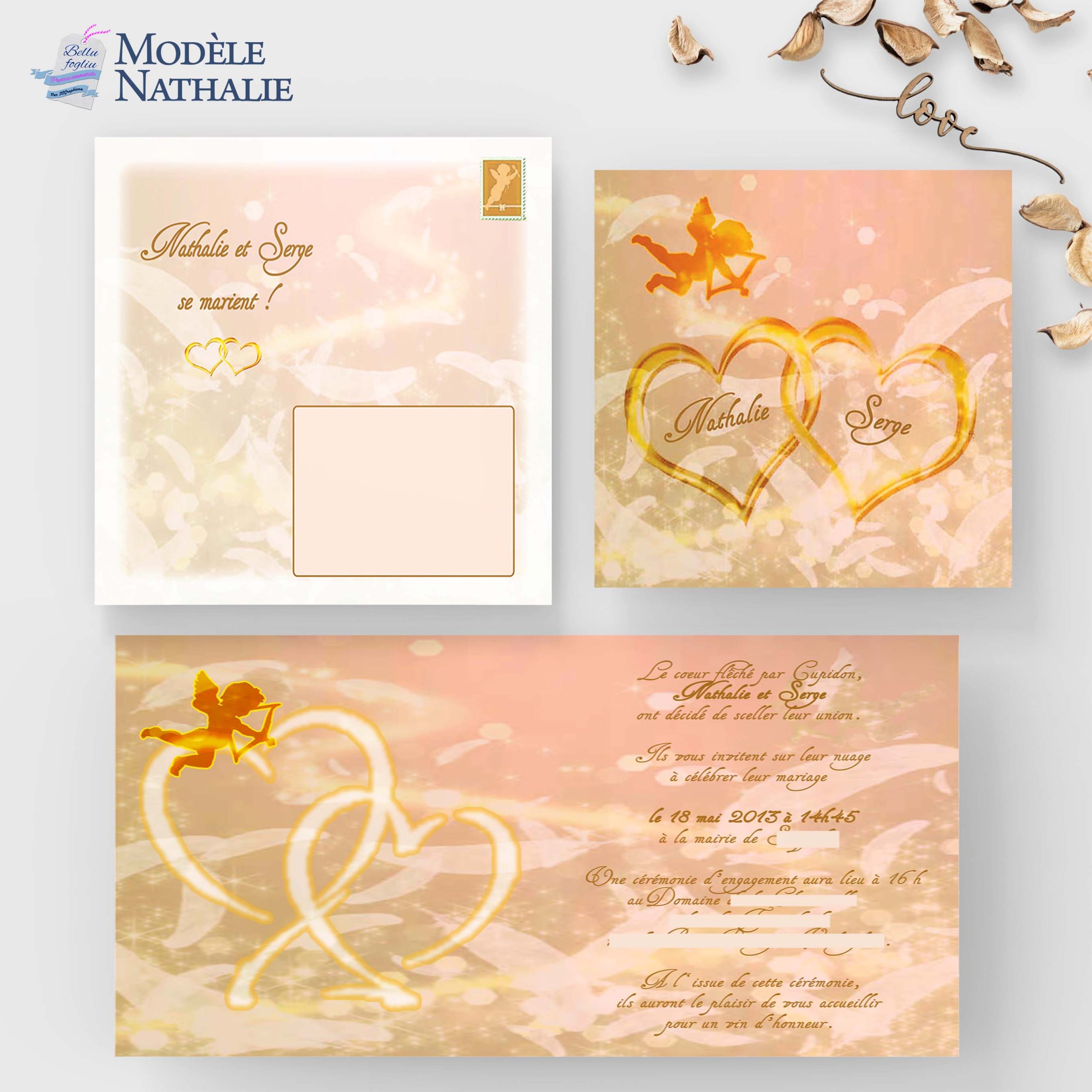 Plongez dans une ambiance céleste avec le faire-part de mariage modèle Nathalie, où des anges, des cœurs et des plumes se rejoignent dans une symphonie de douceur et d’élégance.
