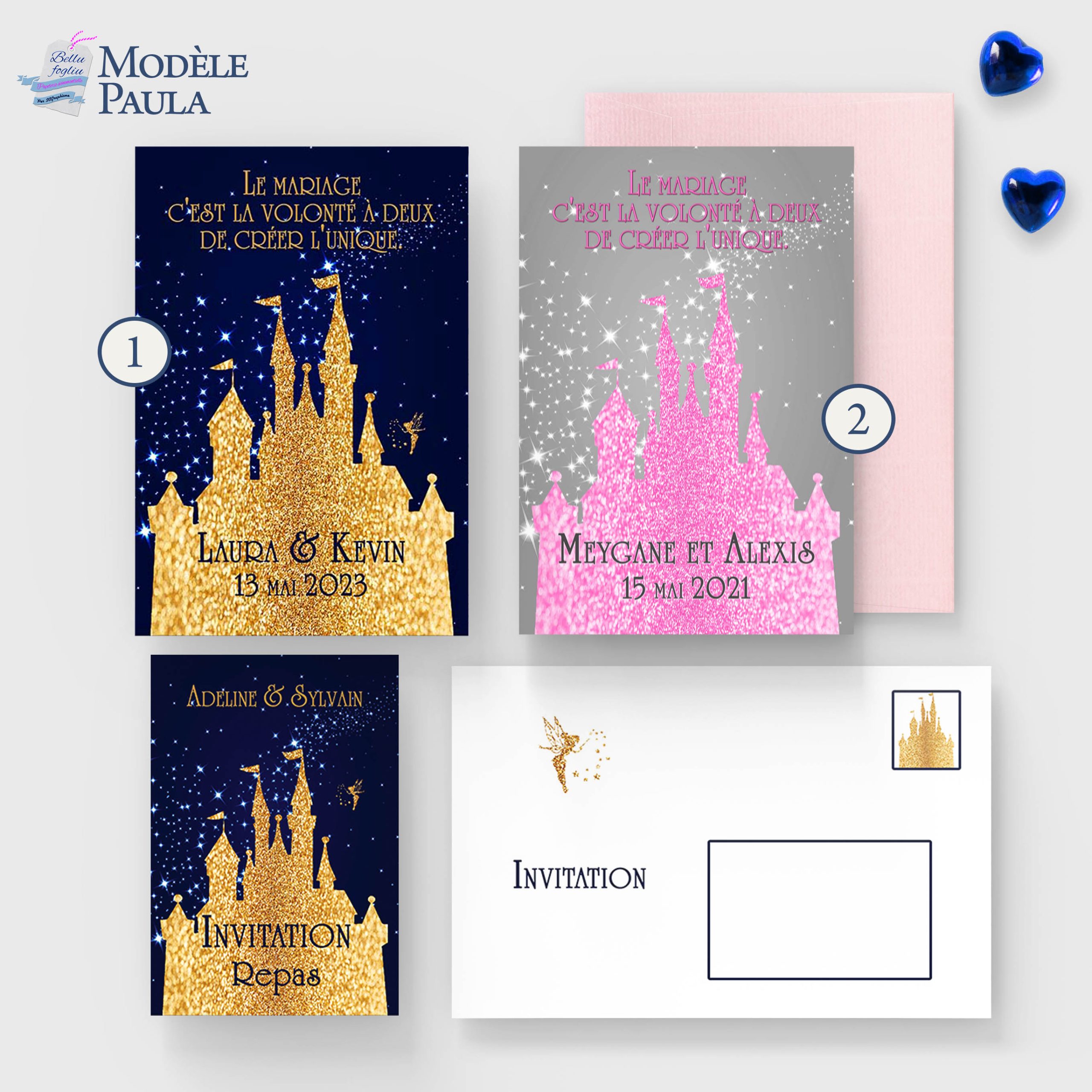 Le faire-part de mariage modèle Paula est une véritable invitation à la magie et à l’enchantement. En mettant à l’honneur le célèbre château Disney, ce modèle transporte vos invités directement dans un monde féerique, où l’amour et les rêves deviennent réalité. Chaque détail de ce faire-part est soigneusement conçu pour évoquer l’élégance et la splendeur de votre journée spéciale, avec un design qui reflète parfaitement l’univers de contes de fées que vous souhaitez créer. Que vous soyez de grands admirateurs de l’univers Disney ou simplement désireux de donner à votre mariage une touche de magie, le modèle Paula saura captiver et émerveiller vos proches dès l’ouverture de l’enveloppe. Préparez-vous à célébrer une journée où chaque instant sera digne d’un véritable conte de fées.