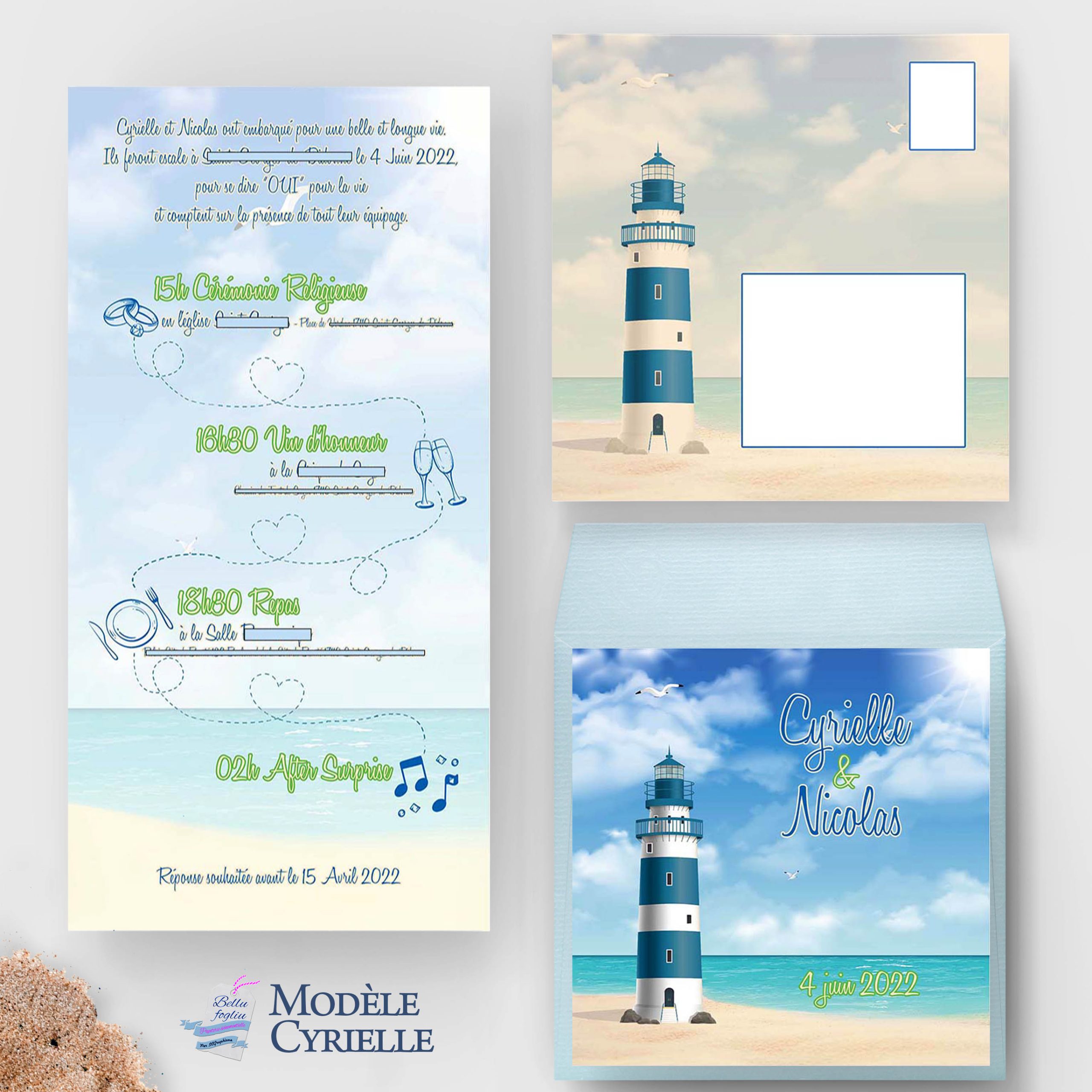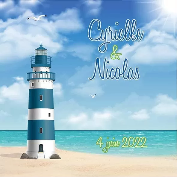 La silhouette iconique d’un phare se dresse au cœur de ce faire-part, symbole d’amour, de guidance et de romantisme intemporel.Chaque élément, soigneusement pensé, transporte vos invités au bord de l’océan, là où les vagues caressent le sable et où la nature marine déploie toute sa splendeur. Cette invitation unique reflète l’authenticité et la fraîcheur d’un mariage célébré dans un décor naturel, entre ciel, mer et plage.