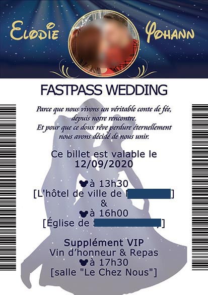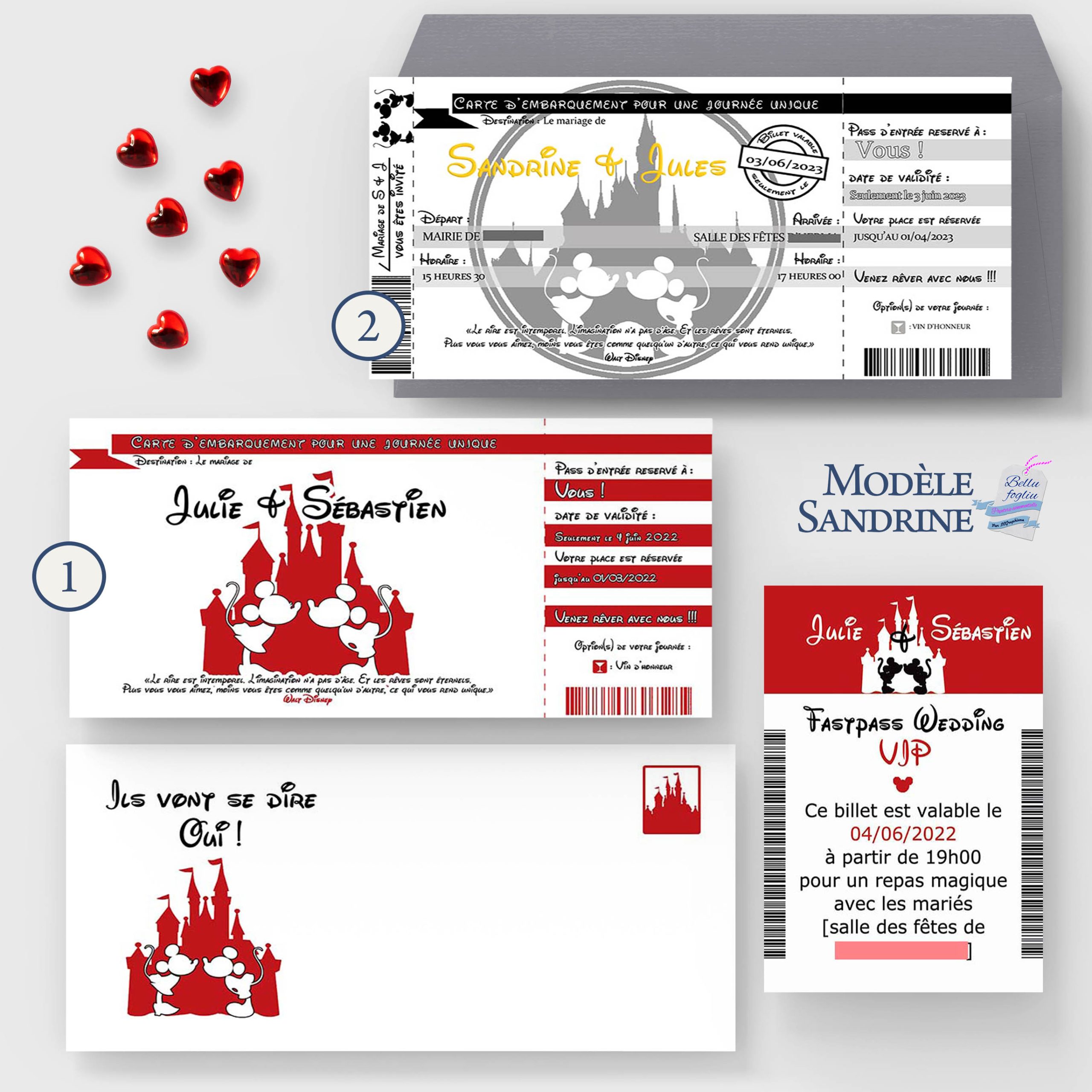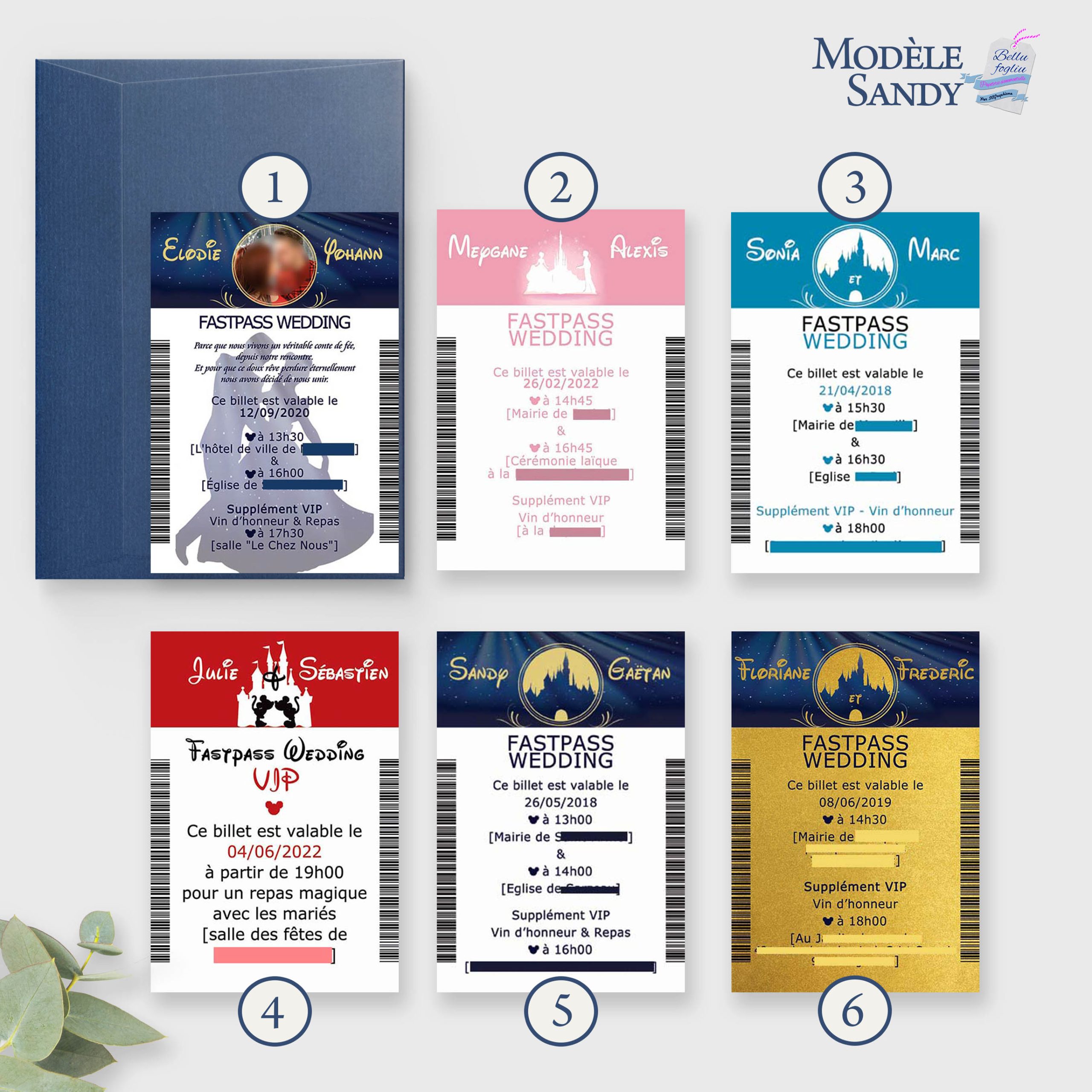 Le faire-part de mariage modèle Sandy est une invitation unique qui fera voyager vos invités directement dans l’univers magique de Disney. Conçu comme un véritable « Fast Pass », ce modèle évoque l’excitation et l’anticipation des plus belles aventures à vivre ensemble. Chaque détail de ce faire-part est pensé pour refléter votre passion pour Disney, transformant vos invitations en une expérience immersive et originale. Le thème « Fastpass Wedding » est parfait pour les couples qui souhaitent ajouter une touche ludique et nostalgique à leur grand jour, tout en assurant à leurs invités une place de choix pour le début de votre propre conte de fées. Avec le modèle Sandy, chaque invité se sentira privilégié et prêt à embarquer pour une journée inoubliable remplie de magie et de bonheur.