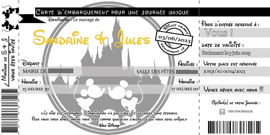 Le faire-part de mariage modèle Sandrine est une invitation magique qui transporte vos invités dans l’univers enchanteur de Disney. Conçu comme un billet de voyage, ce modèle unique met en scène le couple emblématique de Mickey et Minnie, ajoutant une touche de nostalgie et de féerie à votre annonce. Avec ses illustrations charmantes et ses détails soignés, ce faire-part invite vos proches à embarquer pour une aventure inoubliable, où l’amour et la magie se rencontrent. Parfait pour les couples fans de l’univers Disney, le modèle Sandrine est une façon ludique et originale de faire savoir à vos invités que votre grand jour sera rempli de joie, d’émerveillement et de moments dignes des plus beaux contes de fées. Offrez à vos invités un avant-goût de ce qui s’annonce comme un mariage aussi merveilleux qu’un voyage au cœur du monde de Mickey et Minnie.