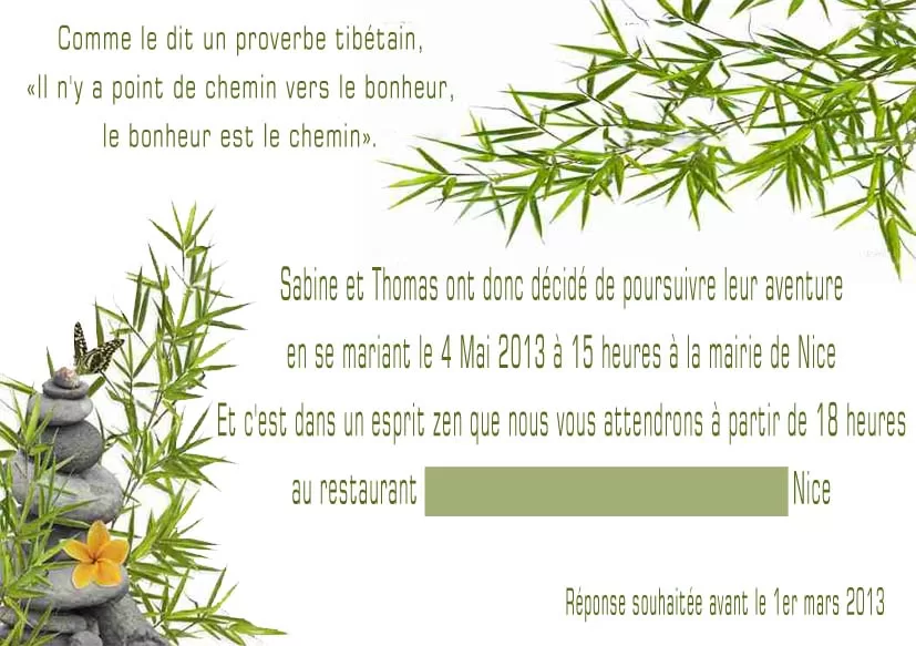 Un mariage très zen et vert avec ce faire-part nature, pierres et bambou.