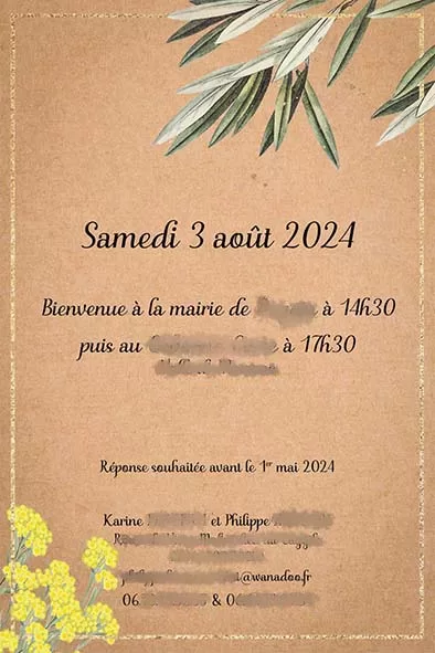 Le faire-part de mariage modèle Kate incarne l’élégance naturelle et l’authenticité, idéal pour un mariage sur le thème nature, kraft et Corse.