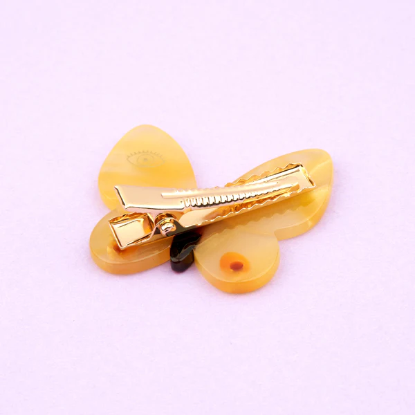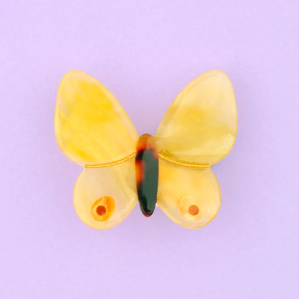 Un petit papillon jaune prêt à vivre sa meilleure vie dans nos cheveux ! On craque pour ses ailes texturées qui imitent les mille reflets de ses congénères de la vraie vie, et les motifs symétriques hypnotisants. Il se pose avec joie dans toutes les coiffures printanières.