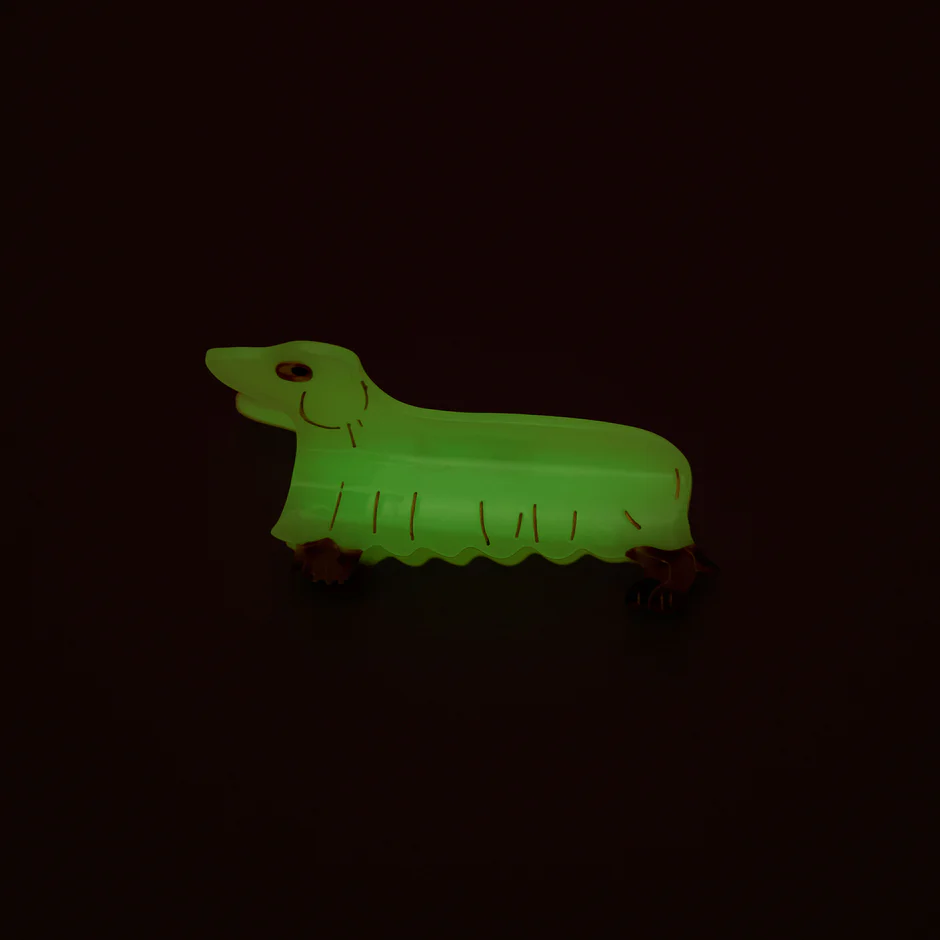 Notre incontournable pince teckel se joint aux fêtes d’Halloween en enfilant son plus beau drap phosphorescent ! On craque pour cet adorable chien fantôme qui rejoint son petit pote chat. Une pince à cheveux originale qui brille de mille feux dans la nuit.