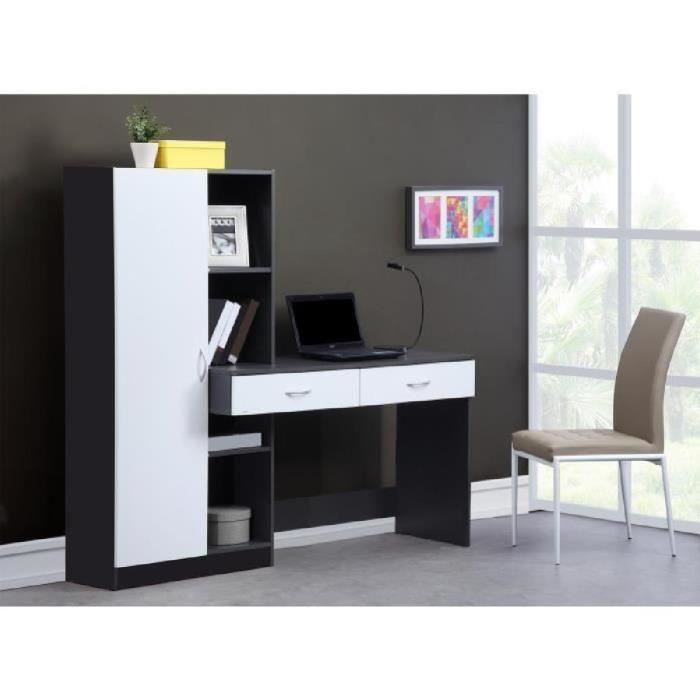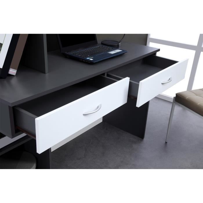 OPTIM Bureau en panneaux de particules recouverts de papier décor blanc et gris – Style et design contemporain – Equipé de 2 grands tiroirs et la partie rangement composé d’une partie fermée (porte) et d’une partie ouverte avec 4 étagères – Dimensions : L 160 x P 45,8 x 147,5 cm.