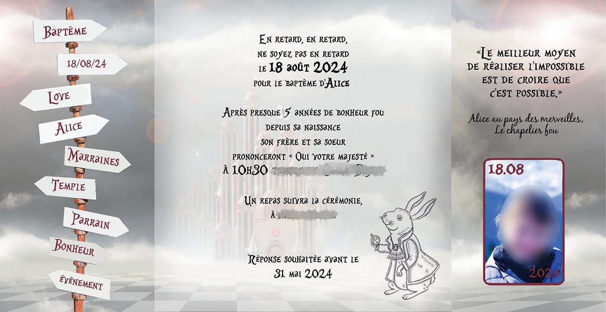 Plongez dans l’univers magique d’Alice au pays des merveilles avec notre faire-part de baptême modèle Alice.