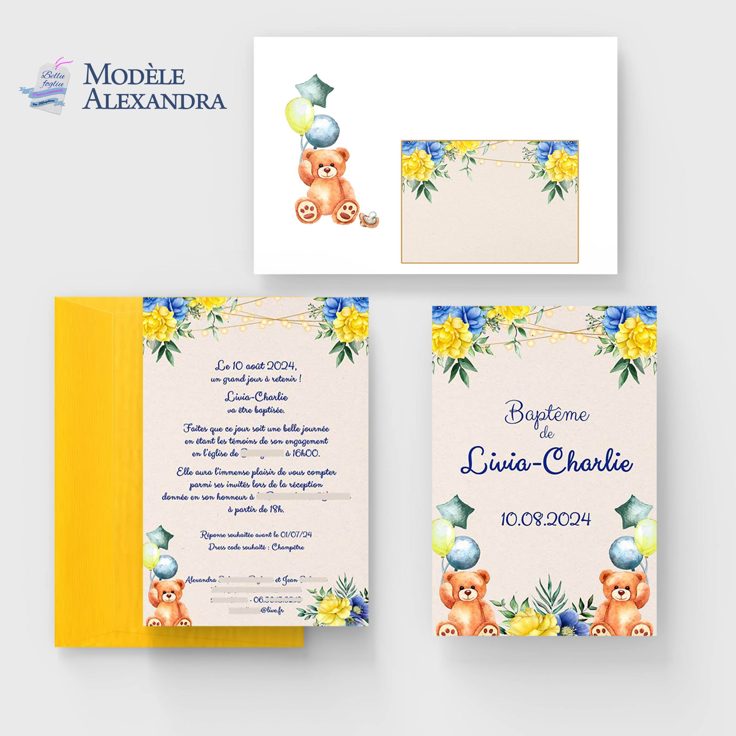 Avec le modèle Alexandra, le baptême de votre enfant sera une célébration pleine de charme et de bonheur, où chaque invité sera invité à partager cette journée mémorable dans un cadre enchanteur et festif.