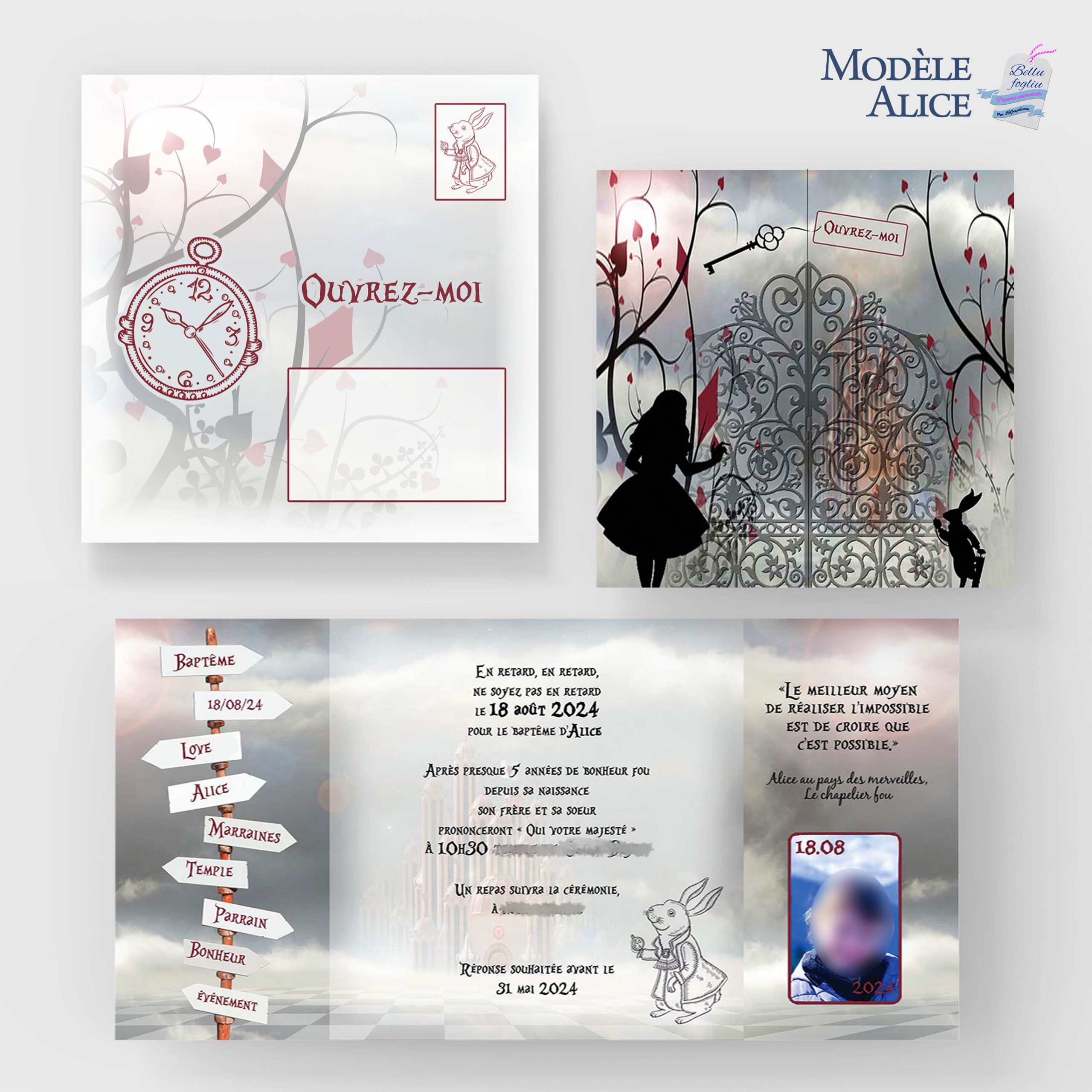 Faire-part de baptême thème au pays des merveilles modèle Alice