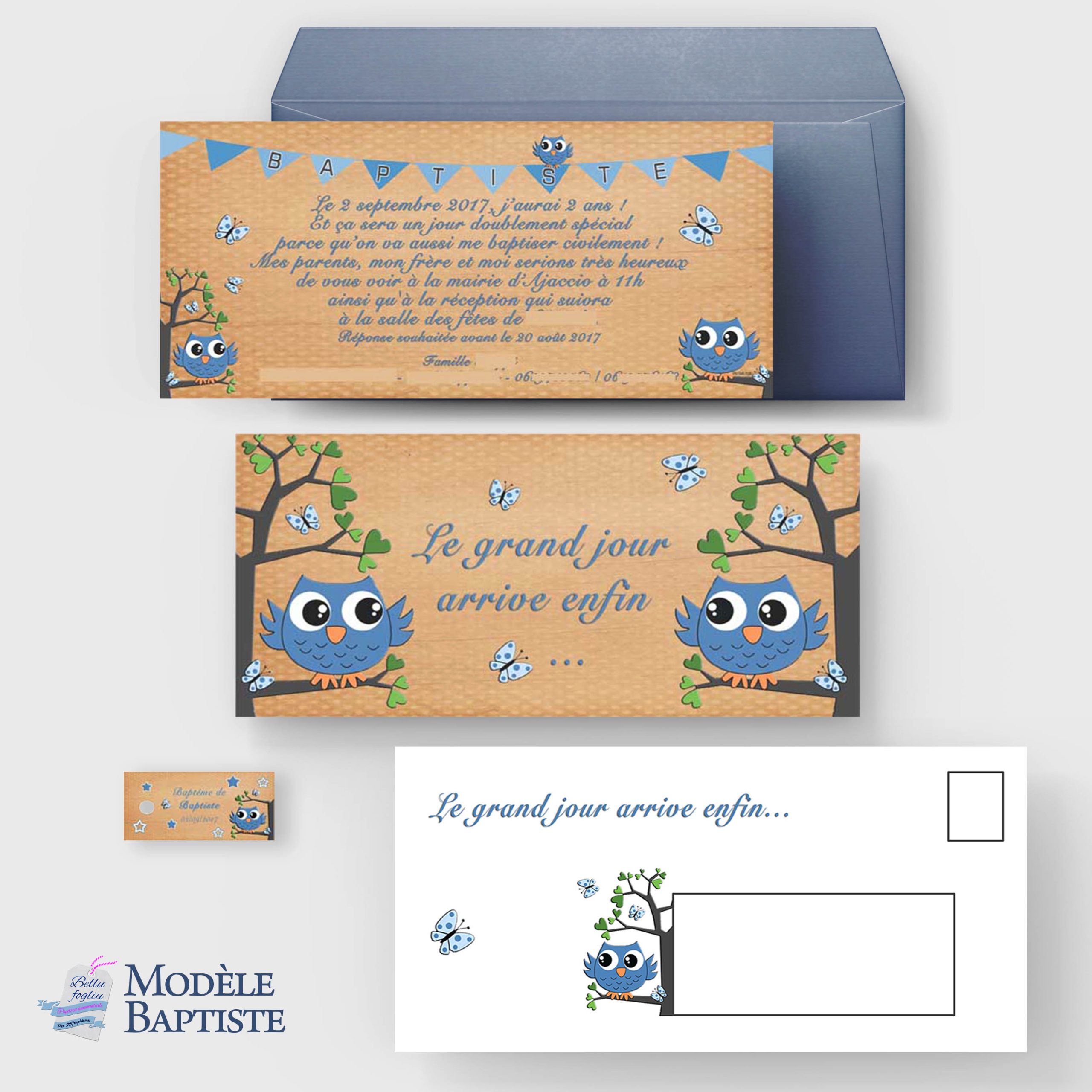 Le faire-part de baptême modèle Baptiste se distingue par sa douceur et son charme naturel. Avec ses tons apaisants de bleu et de beige foncé, il évoque la sérénité et l’innocence de l’enfance. Les petits hiboux nichés dans leurs arbres, accompagnés de papillons légers, créent un univers tendre et chaleureux, parfait pour célébrer cet événement si spécial. Ce modèle reflète à la fois la simplicité et l’élégance, tout en s’harmonisant avec un thème nature ou bohème. Une invitation pleine de poésie qui annoncera avec délicatesse le baptême de votre enfant à vos proches.