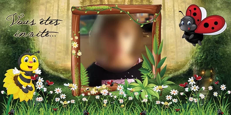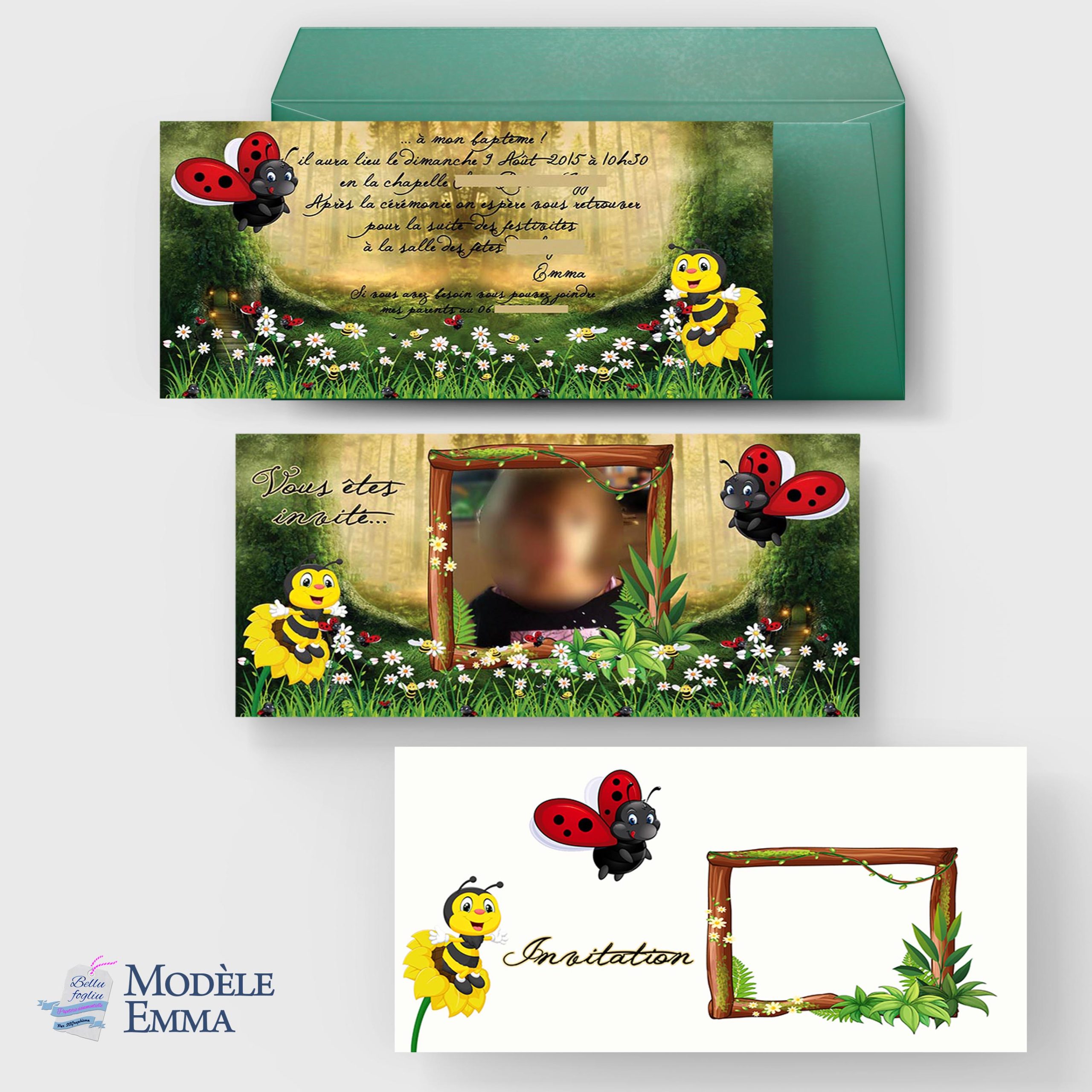Le faire-part de baptême modèle Emma vous transporte dans un univers féérique avec son décor de forêt enchantée. Entre délicates fleurs, une adorable coccinelle et une joyeuse abeille, chaque détail évoque la douceur et la magie de l’enfance. Ce modèle est une invitation pleine de charme, idéale pour célébrer une belle journée de baptême placée sous le signe de la nature et de la tendresse. Avec ses tons doux et son design enchanteur, il séduira vos proches et marquera cet événement unique avec élégance et poésie. Une véritable ode à l’innocence et à la joie de vivre.