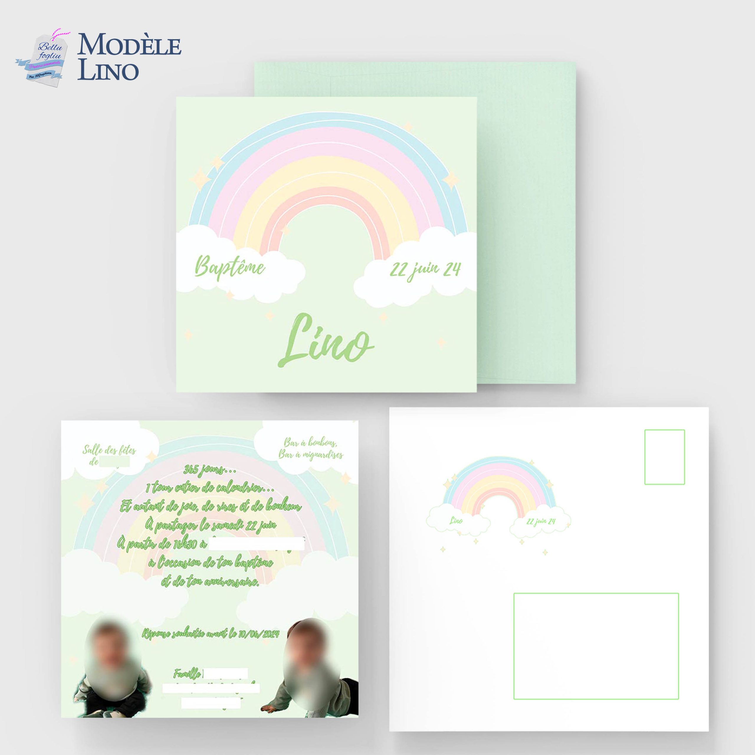 Plongez dans la douceur de l’innocence avec notre faire-part de baptême modèle Lino, où un arc-en-ciel aux couleurs pastel se déploie gracieusement parmi les nuages, sur un fond vert menthe délicat.