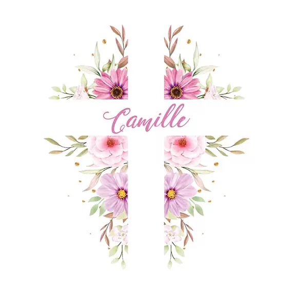 Ornée d’une croix florale délicate, cette invitation évoque la pureté et la beauté de l’occasion.