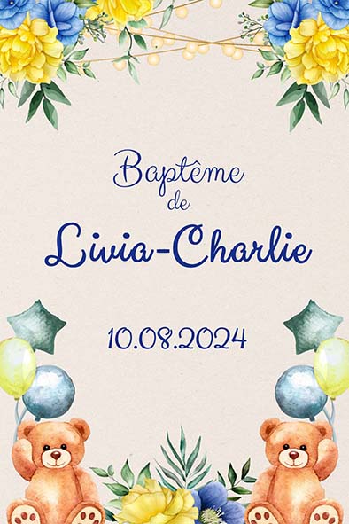 Personnalisé avec le prénom du futur baptisé au cœur de l’ensemble floral, il ajoute une note personnelle et chaleureuse à votre annonce.