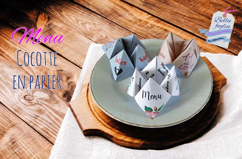 Envie d’avoir des menus différents ? Optez pour la version cocotte en papier, en plus d’être original cela rappellera des souvenirs d’enfance à vos invités.