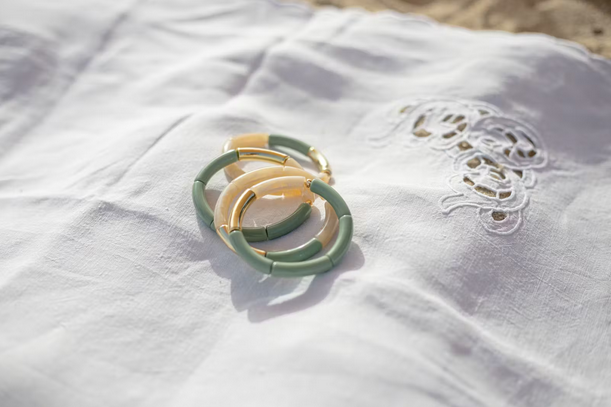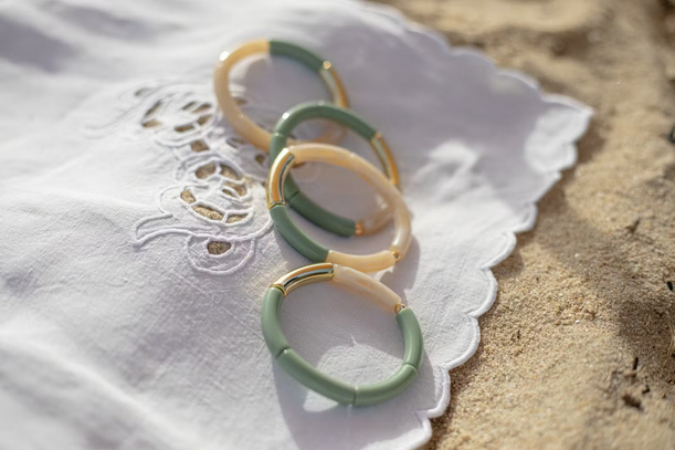 Bracelet élastique composé de différentes perles de couleurs douces alternées avec un détail doré.