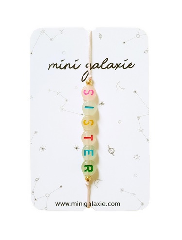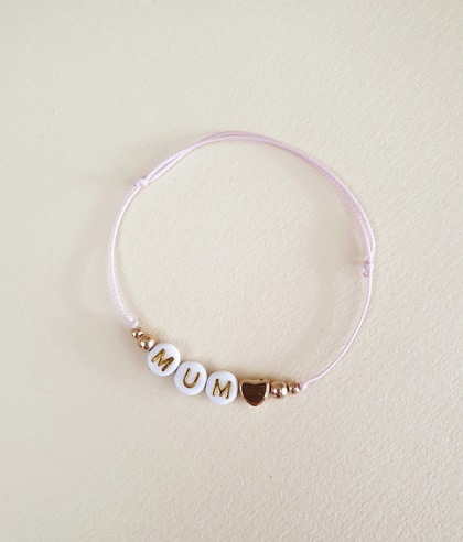 Ce bracelet est composé de perles blanches avec lettres dorées et d’un cordon de couleur rose pastel.