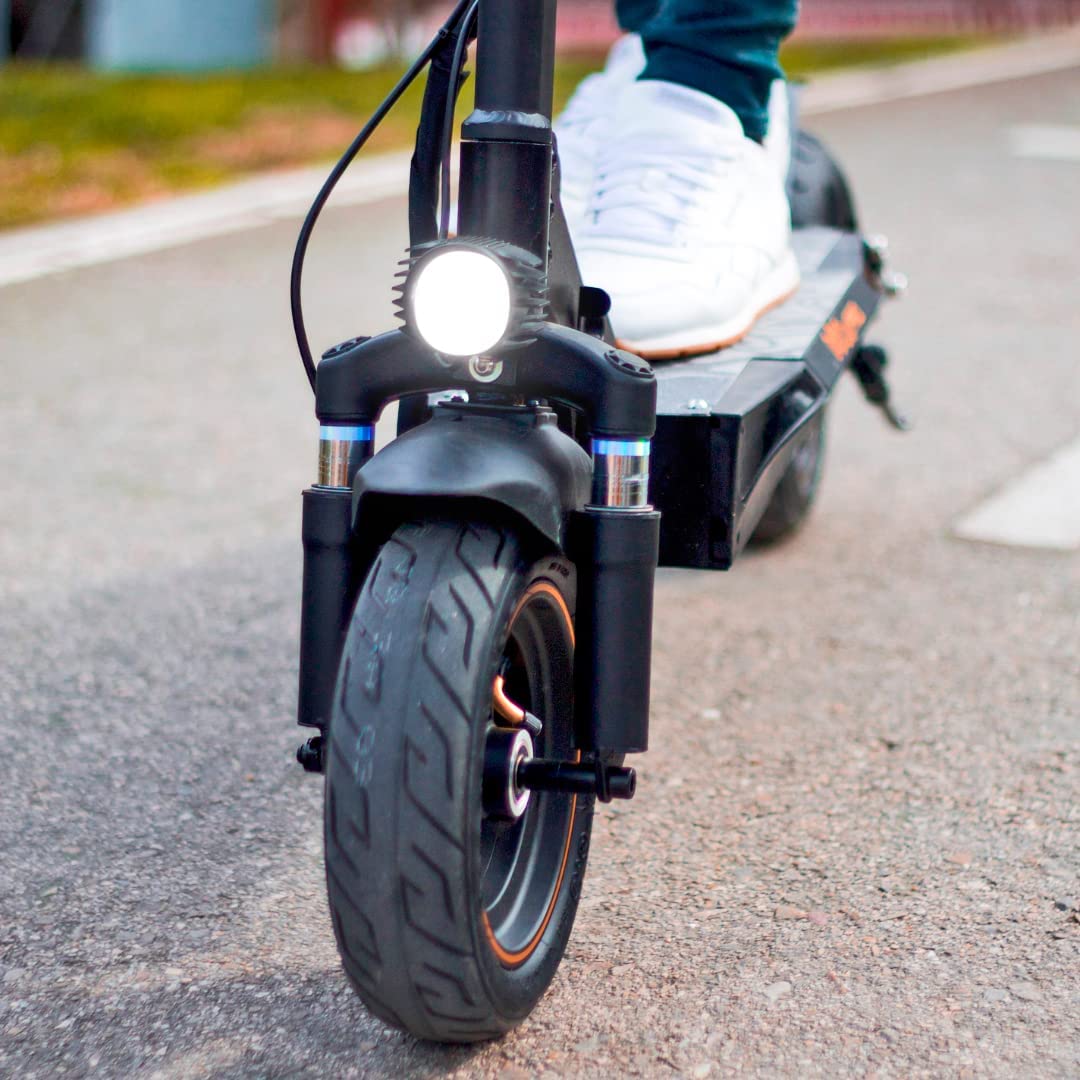 Pneus tubeless 10″, résistants et stables, prêts à rouler sur tous les types de terrain et freins à disque. Affichage au guidon avec informations sur la batterie, les km parcourus, l’odomètre, le sélecteur de vitesse et la configuration du scooter.