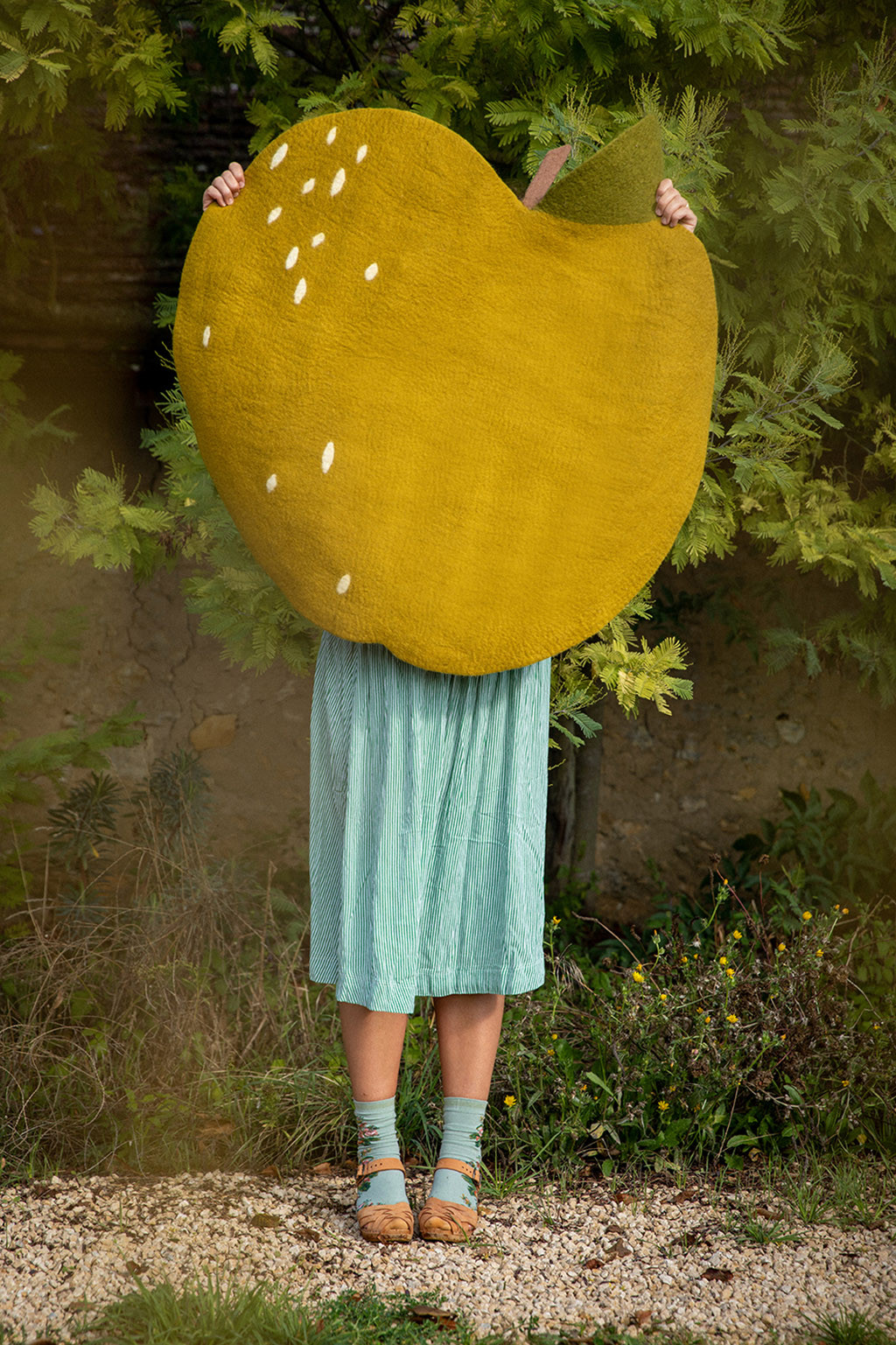 Pour compléter la famille des tapis en feutre VEGGIE, voici la pomme ! Avec la clémentine et la poire, voilà des fruits qui apportent de la bonne humeur dans la maison. Avec ses formes toutes à la fois gourmandes et naïves, il trouvera sa place dans une chambre d’enfant pour s’allonger et jouer dessus. Dans la cuisine ou dans l’entrée, notre tapis pomme en laine feutrée sera idéal pour créer une ambiance ludique et colorée.
